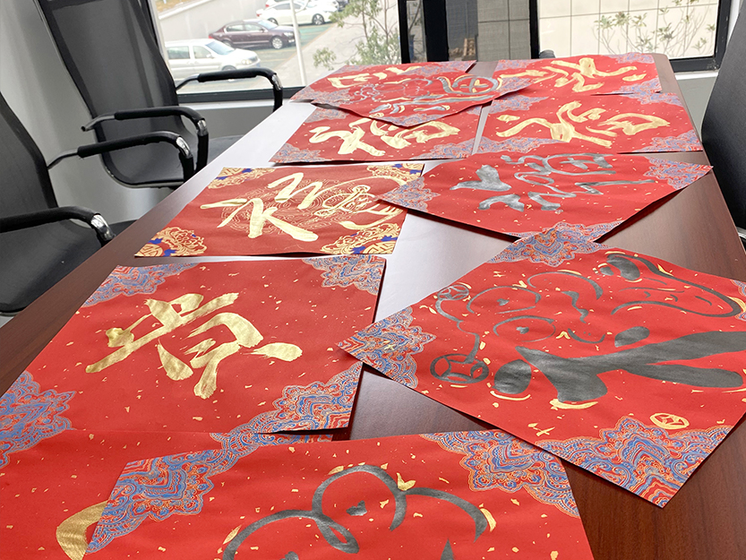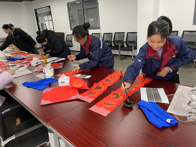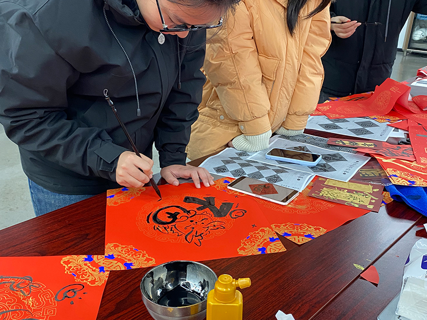 新年不可或缺的就是“新桃换旧符”。红艳艳的春联、斗拱纸一字排开,参与活动的大家伙儿们纷纷挥毫泼墨,把对新一年的美好祝福融入墨香里,镌刻在红纸中。