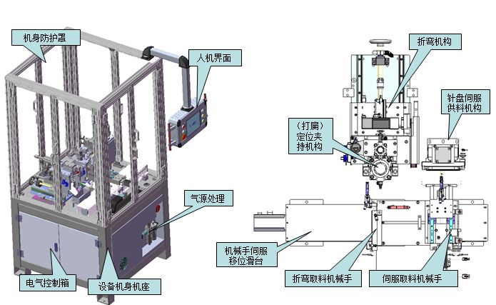 操作人员将装好产品的针盘放入自动供料伺服机构后,设备即可按程序设定的参数自动运行,针板伺服取料机械手先将产品从针盘内取到(打扁)折弯工站,加工完后由折弯取料机械手将产品放入成品收集盒内再去抓取下一个加工完的产品,循环实现(打扁)折弯加工的自动化加工。该设备通用性强,快速高效,能适用多种规格的产品生产。